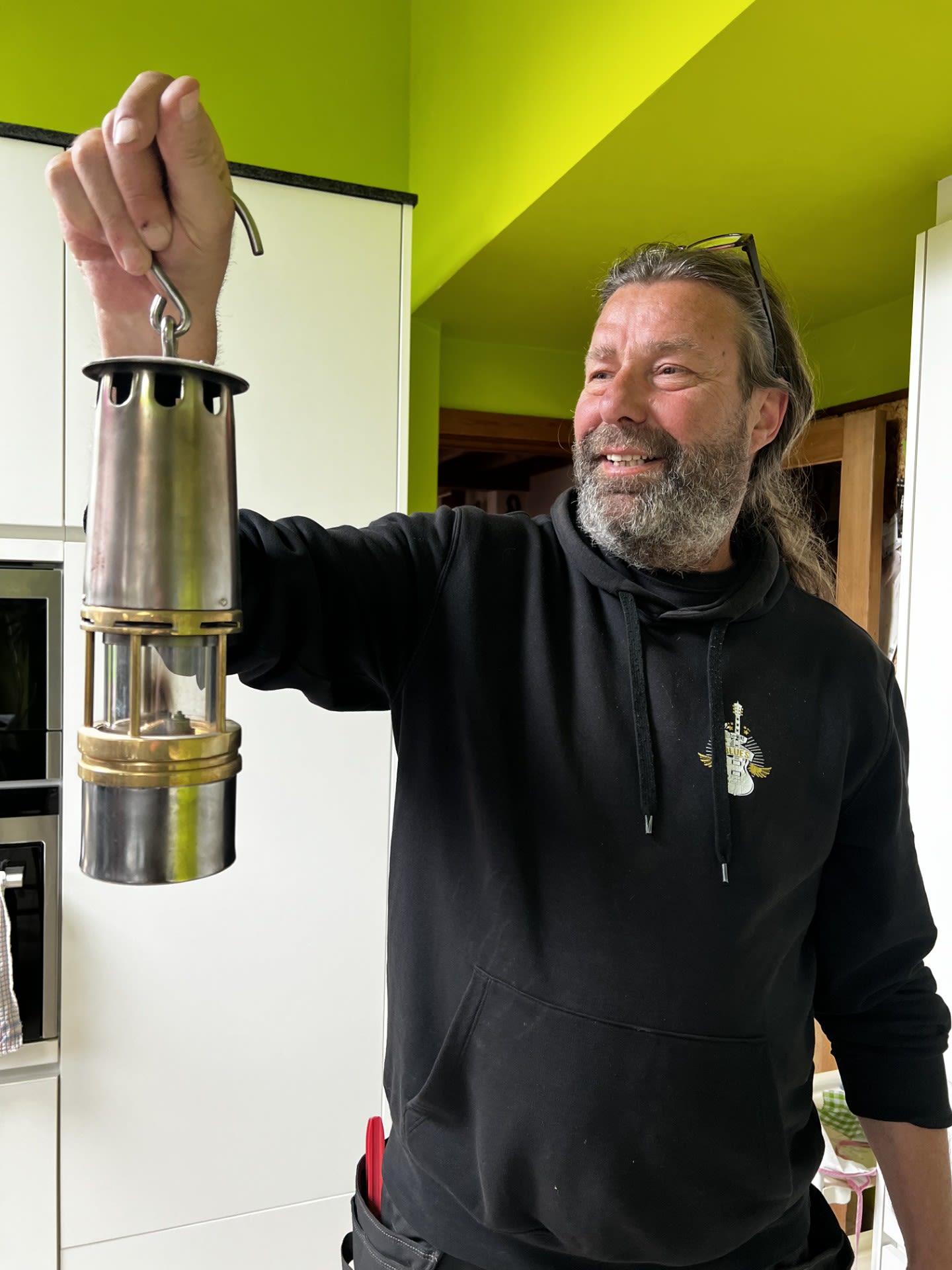 Foto: ex-mijnwerker Wilfried Dekinder toont zijn mijnwerkerslamp, waarvan de grootte van de vlam de hoeveelheid mijngas aangaf.