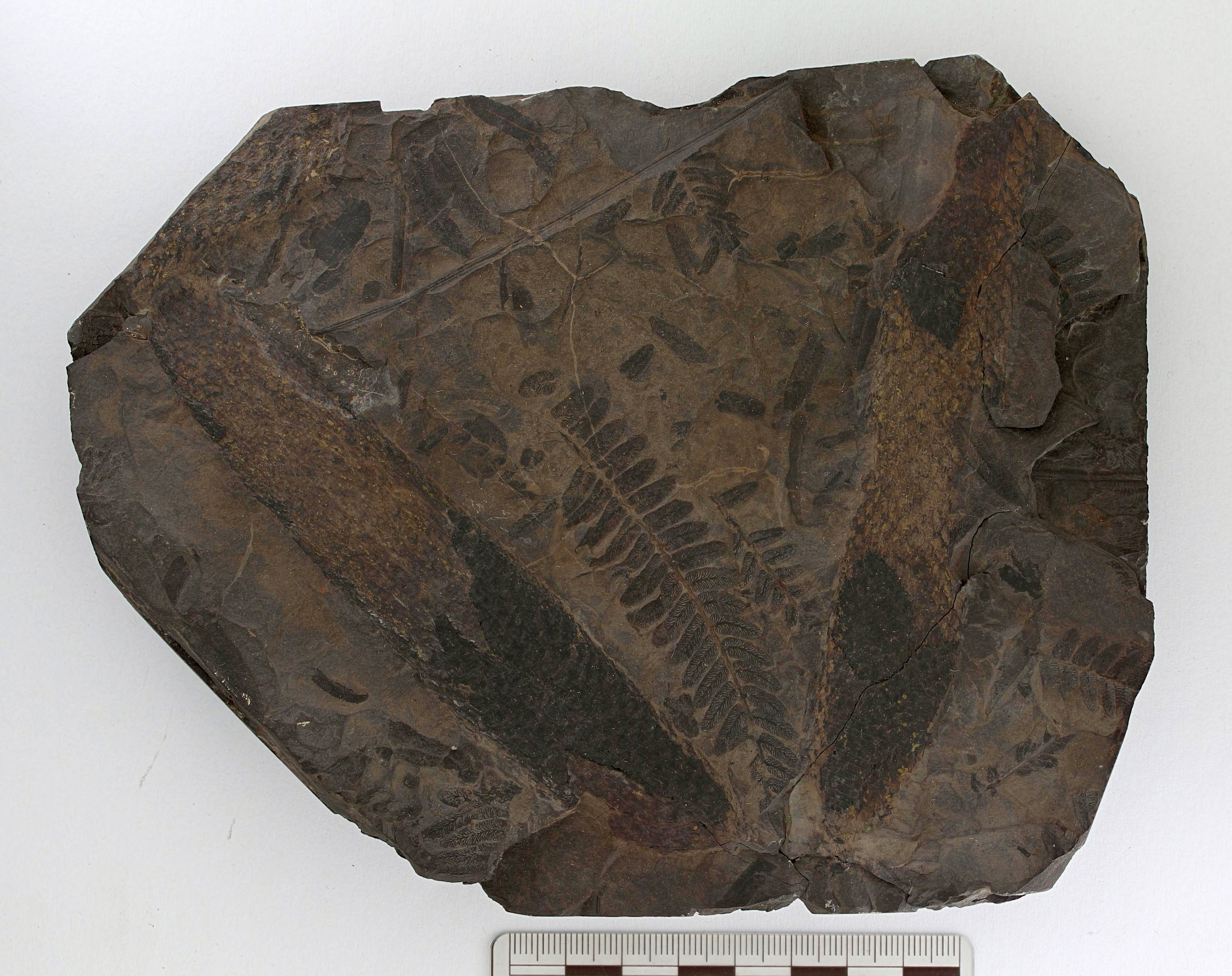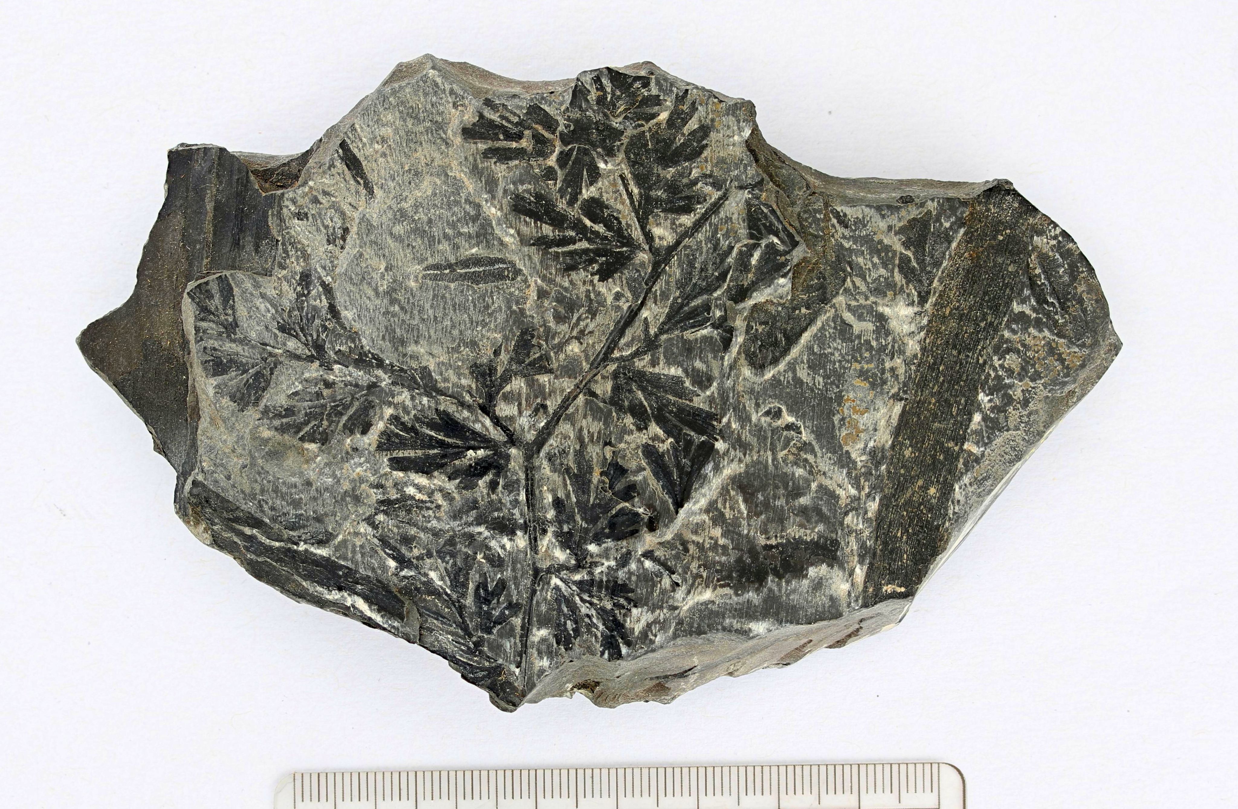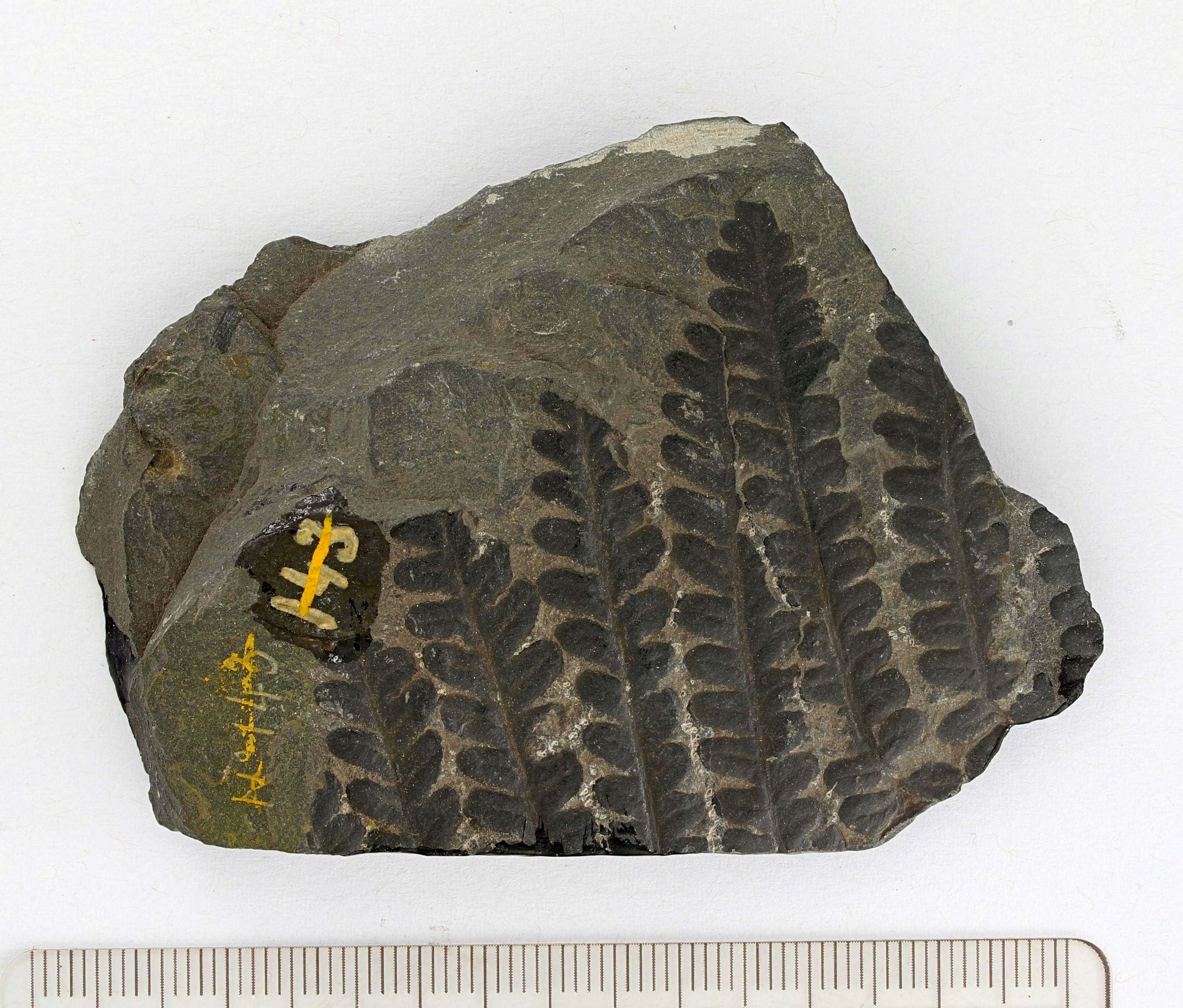 Bladeren van hoog opschietende zaadvarens. De bladeren (met namen als Pecopteris of Asterotheca) lijken wel een beetje op die van varens, maar het zijn zaadplanten, geen sporenplanten. (Foto: Erik Van de gehuchte, Instituut voor Natuurwetenschappen)