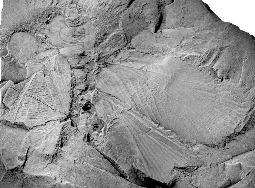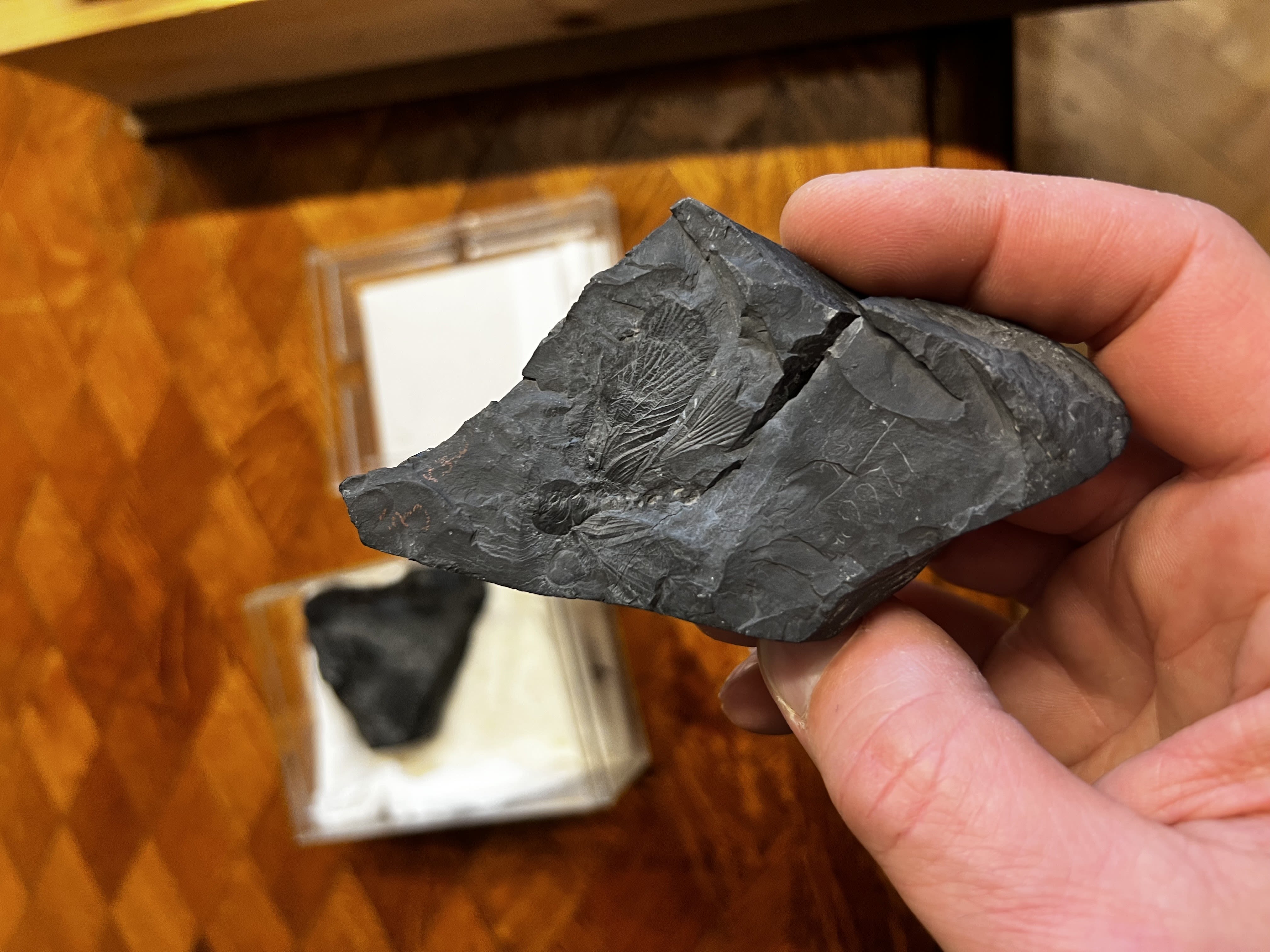 Ik zie petieterige maar mooi gelijnde achterlijven van oerspinnen (zoals Brachypyge), en tot mijn grote vreugde ook kleine zeeschorpioenen (Eurypterus) en degenkrabben (Euproops), die zich blijkbaar aan brak of zoet water hadden aangepast. En dan, alsof Sinterklaas langskwam, krijg ik stukken van Arthropleura in m’n handen, een miljoenpoot die meer dan twee (!) meter lang kon worden, het grootste ongewervelde landdier ooit. Een icoon van het Carboon. De fossielen van deze planteneter die we hier in België hebben, zijn niet veel meer dan fragmenten van het pantser waar je, als je goed kijkt, een paar knobbels op herkent. Maar toch: een zeldzaam spoor dat deze indrukwekkende dieren in onze streken leefden.