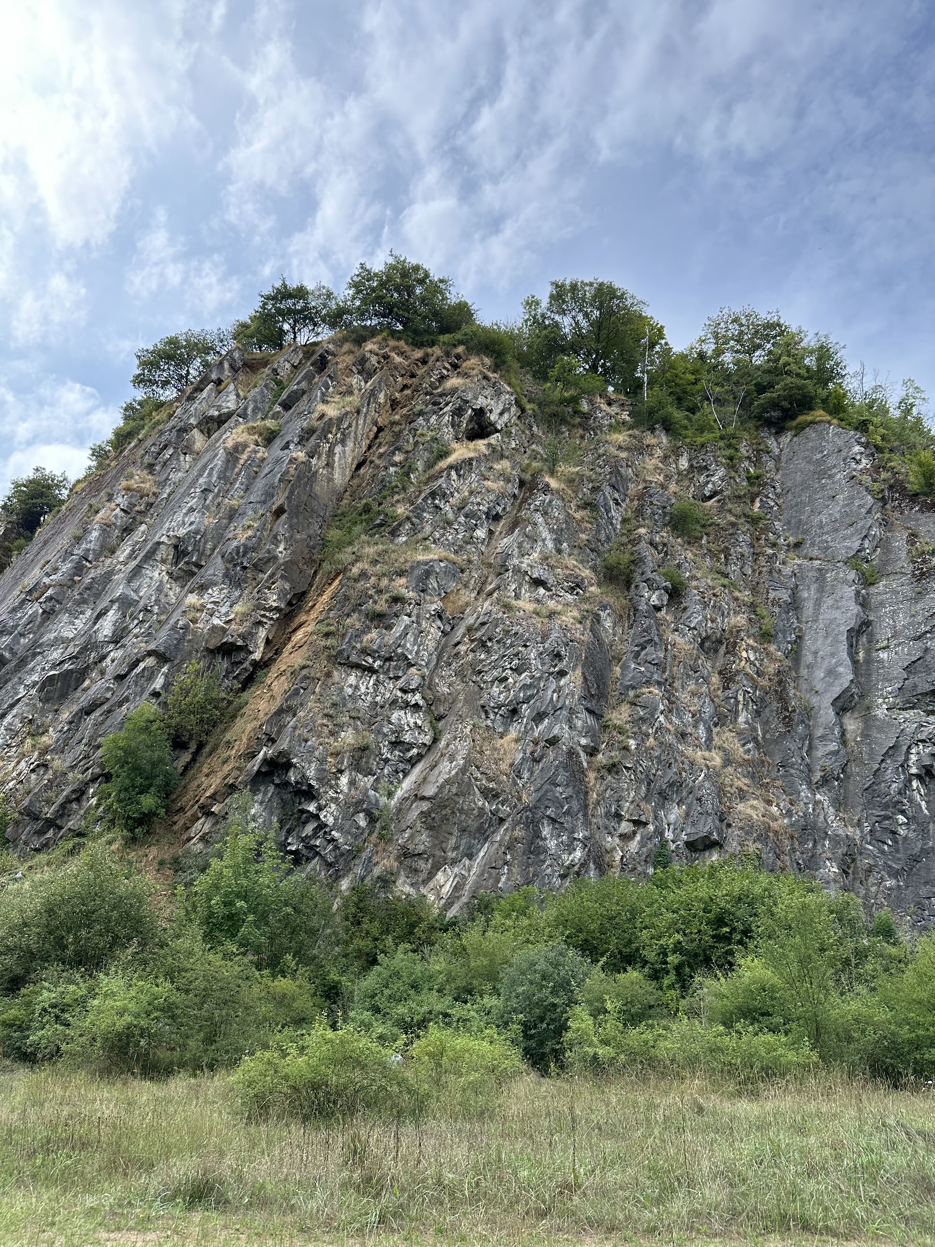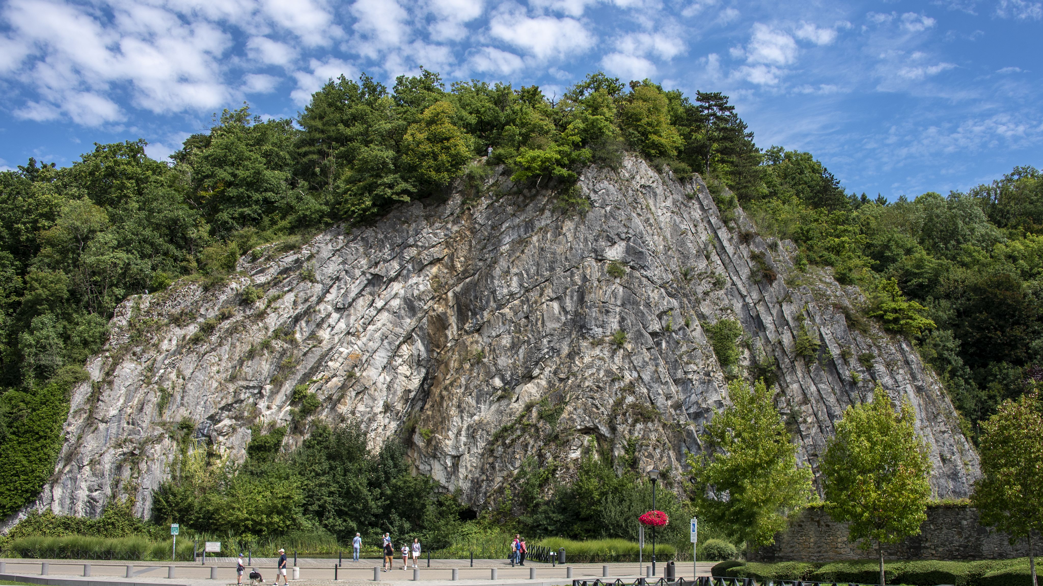 Maar voor dit menselijke verhaal heeft geoloog Kris Piessens van het Instituut voor Natuurwetenschappen me niet naar hier gebracht. Hij legt zijn hand op de schuin aflopende grijsblauwe rots, die majestueus boven ons uittorent: ‘zit vol verbrokkelde kalkskeletjes.’ Het is een tijdgenoot van de bekendere kalksteenrotsen van Dinant (le Rocher Bayard, les Rochers de Freÿr en de Citadel van Dinant) en het dolomiet van Marche-les-Dames bij Namen, waar Koning Albert I tijdens een klimoefening de dood vond. Ze zijn de getuigen van een rustige tropische helderblauwe zee tijdens het vroeg-Carboon (Dinantiaan, 359 tot 330 miljoen jaar geleden).