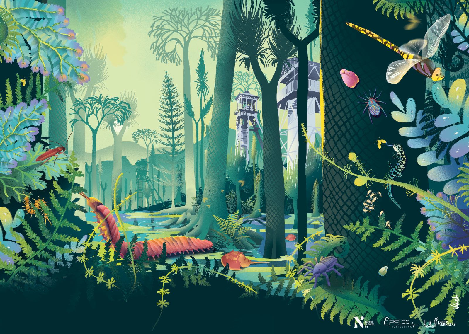 Waarom konden veel insecten in het Carboon zo groot worden? De afwezigheid van predatoren zal een rol gespeeld hebben, en wellicht ook de lucht. Michiel Dusar: ‘De toename van de biomassa op het land zorgde voor een omgekeerd broeikaseffect. Het CO2-niveau in de atmosfeer daalde, en het zuurstofgehalte nam toe. Tot wel 25 procent zuurstof, meer dan de twintig procent vandaag. Door het vele zuurstof konden insecten groter worden. Ze hebben geen efficiënte longen en moesten het dus hebben van hogere concentraties in de lucht.’