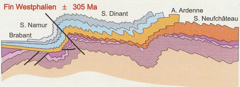 Op de noordrand van Gondwana, op de ‘bumper’, zitten Frankrijk en Zuid-Duitsland (voor wie het zich afvraagt: Noord-Frankrijk en Noord-Duitsland lagen op ons continent, al van toen we Avalonië waren 480 miljoen jaar geleden). De ravage van de botsing is groot. ‘De resten van onze oudste bergen worden van hun wortels losgescheurd en verwerkt in het nieuwe, hogere gebergte dat de Ardennen nu aan het worden zijn. De kalksteenlagen breken en worden soms letterlijk op hun kop gezet: de jongste lagen onderaan, de oudste vanboven. En de steenkoolbekkens plooien.’