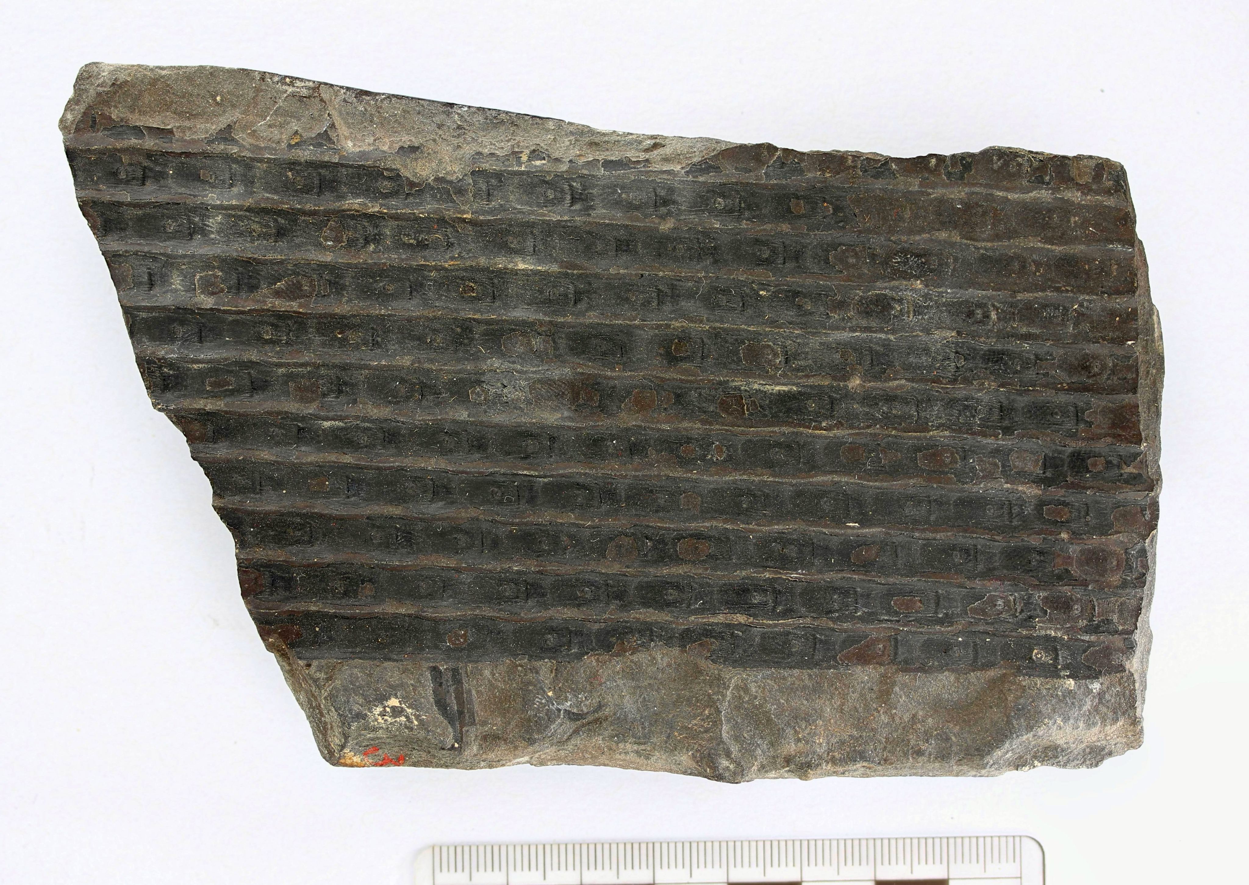 Bij de wolfsklauwachtige Sigillaria of zegelboom lopen de littekens van afgevallen bladeren in rechte lijnen over de bast. Als waren ze met een stempel (zegel) aangebracht. (Foto: Erik Van de gehuchte, Instituut voor Natuurwetenschappen)