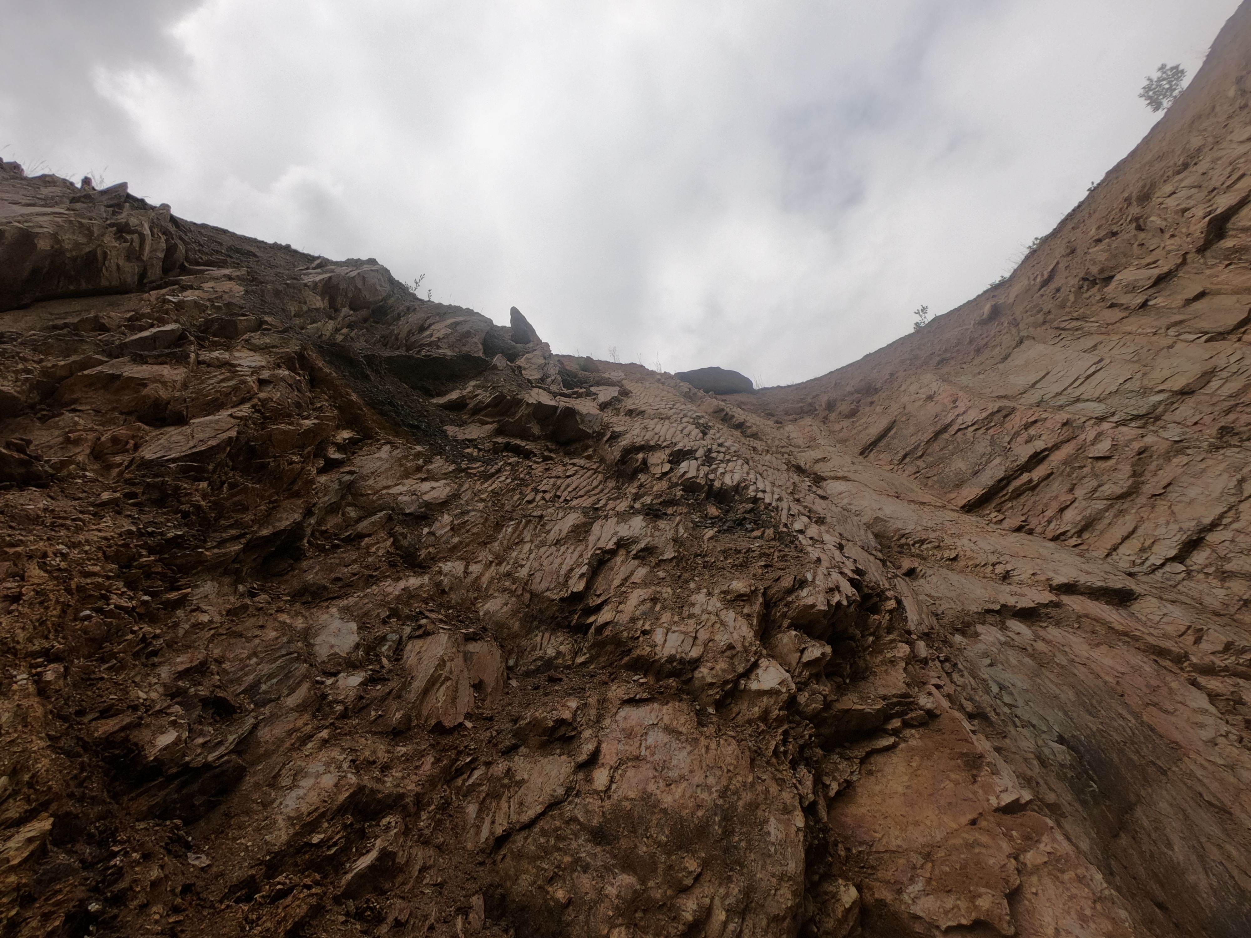When subterranean turmoil occurs, a calcareous package of that type slides towards the deeper and calmer waters of the south, like a cloud of dust underwater. Once there, the pale lime is deposited on top of the metallic clay layer. Every yellow streak here, and there are an awful lot of them, bears witness to a period of powerful volcanic eruptions at the time when our country became separated from Gondwana. It must have been a very eventful period. With every eruption that took place, Avalonia become more consolidated than before.’