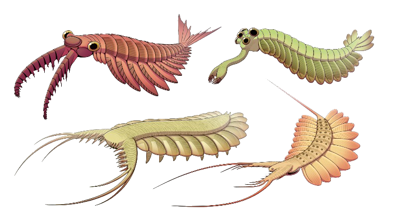The group of Dinocaridida: Anomalocaris (top left), Opabinia (top right), Pambdelurion (bottom left), and Kerygmachela (bottom right). (Image: @ni075, Wikimedia)