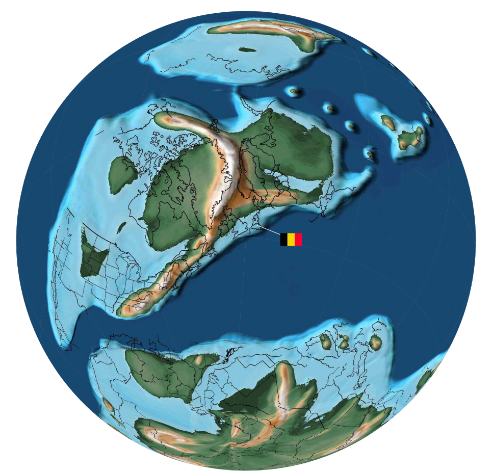 La Belgique, il y a 406 millions d’années, sur le continent tout juste formé de Laurussia (ou Euramérique), né de la collision de Laurentia (l’actuelle Amérique du Nord et le Groenland), de Baltica (l’Europe du Nord) et de l’Avalonie (l’Europe du Nord-Ouest). Ces collisions ont entraîné l’élévation de la chaîne calédonienne.
